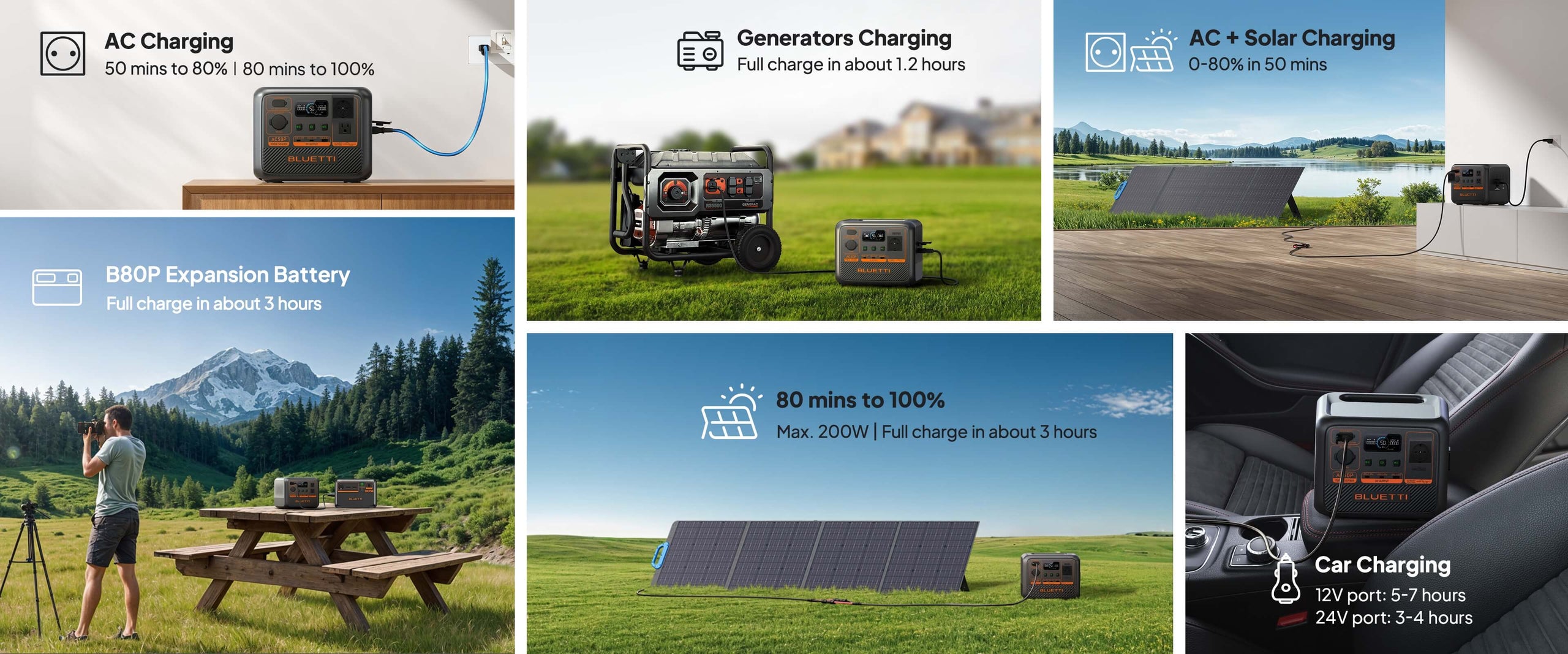 - 6 Ways to Recharge: Flexible to get charged via AC, solar, car, generator, B80P battery, or dual AC + solar